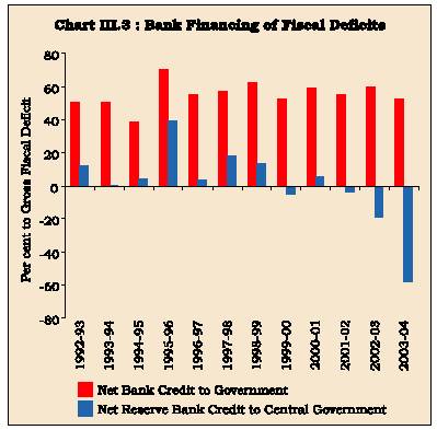 3.44 As discussed in Section I, there are limits to the effectiveness of monetary policy in containing inflation in the face of an expansionary fiscal policy. Accordingly, monetary-fiscal coordination is often emphasised in order to achieve price stability. In India too, following the balance of payments crisis of the early 1990s, structural reforms addressed the issue of imparting monetary policy greater flexibility. This was done through, inter alia, raising market borrowings at market-related yields and the phasing out of the automatic monetisation through ad hocs. These measures were able to reduce the reliance on the Reserve Bank significantly from mid-1990s onwards5 . It is now clear that the Reserve Bank is able to control the timing and form of its accommodation to the Government. The more critical issue is whether the Reserve Bank would be able to contain the volume of its support to the Government, once liquidity conditions change - either because domestic credit demand picks up or capital flows dry up. Not only is the Centre's fiscal deficit still substantial, but the share of net bank credit to the Government in financing the fiscal deficit remains high (Chart III.3). Monetary management, however adroit, and monetary-fiscal co-ordination, however seamless,