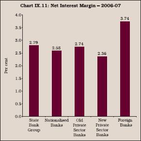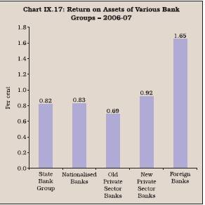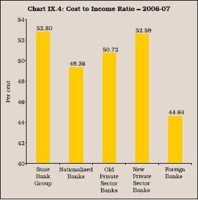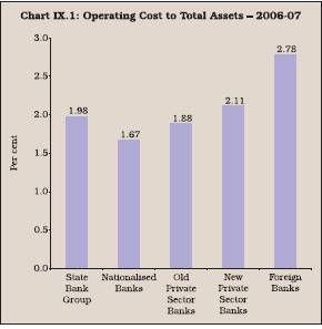 9.16 A comparison of cost to asset ratio across the bank groups shows that during 2006-07, the cost to asset ratio was the lowest for nationalised banks, followed by old private banks, State Bank group and new private sector banks. It was the highest for foreign banks (Chart IX.1).