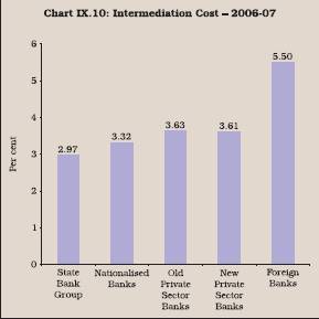 9.32 Consequent upon the initiation of financial sector reforms, there has been a gradual decline in the cost of intermediation in India. The intermediation cost at the industry level declined from 6.24 per cent during 1991-92 to 3.43 per cent in 2006-07 (Table 9.10). The decline in the intermediation cost is in sync with the decline in the cost to income ratio. The decline was noticed across all banks groups, reflecting increased competitive pressures. 9.33 During 2006-07, the intermediation cost was the lowest in the case of State Bank group (2.97 per cent), followed by nationalised banks (3.32 per cent),new-private sector banks (3.61 per cent), old private sector banks (3.63 per cent) and foreign banks (5.50 per cent) (Chart IX.10).