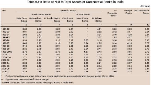9.36 Historically, Indian banks had high NIM due mainly to lack of enough competition. The increased competitive pressures in the industry following the initiation of reforms appear to have exerted downward pressure on the spreads. The NIM for the industry, which was 3.30 per cent in 1991-92 declined to 2.57 per cent in 2001-02. From 2002-03 onwards, with a pick-up in economic activity and unprecedented credit growth, NIM exhibited upward movement and reached to 2.87 per cent by 2003-04, before moderating to 2.69 per cent level by 2006-07 (Table 9.11).