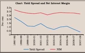 In the case of India, there has been flattening of yield curve with yield spread (between 1 year and 10 year Government securities) contracting from 3.22 per cent in 1996-97 to 0.72 per cent in 2006-07. The reason for this was the decline in long term rates and relative stability of short term rates as inflationary expectations remained well-anchored. The NIM has been following yield spreads with a lag possibly because lending and deposit/borrowing rates do not get adjusted to the market movements instantly. Correlation between yield spread and NIM with a one year lag was around 0.68 (Chart).