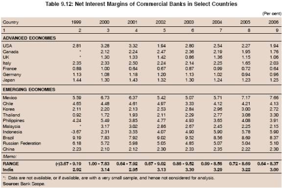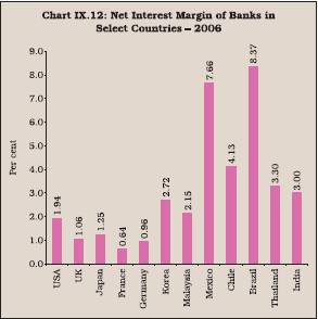 9.40 The cross country evidence suggests that there are wide variations in NIM across the banking sectors in different countries (Chart IX.12). The NIM generally declined in all the developed countries in the first half of the 2000s. However, generally NIM in advanced countries such as the USA, the UK, Canada, Japan, Germany and France was less than two. Notwithstanding the recent decline, the overall level of NIM of Indian banks was marginally higher than that prevailing internationally. The NIMs in emerging economies were much higher than in advanced countries with Brazil being at 8.37 per cent, followed by Mexico (7.66 per cent) and Indonesia (5.90 per cent). The high spreads in Brazil could be attributed to a credit programme that requires banks to allocate a significant portion of their loans to selected high-risk, high-cost borrowers at below-market interest rates. Banks offset their losses in the selected market by charging a disproportionately higher spread in the non-selected market (Souza Sobrinho, 2007). The average NIM in India, however, was comparable to several countries in Asia such as Thailand, Korea and Philippines (Table 9.12).