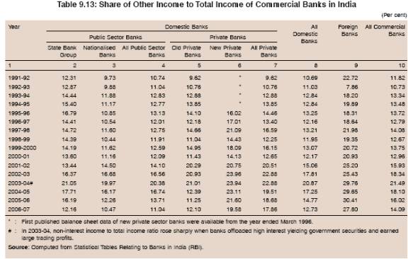9.112 Banks’ main source of income is net interest income, which provides stability to earnings. However, non-interest sources of income can help in sustaining the earnings. This is particularly the case when activity of non-interest source of income and the main activity are negatively co-related. At present, banks’ non-interest sources of income constitute very small portion of their total income. This is particularly so in the case of public sector banks as their non-interest income ratio in 2006-07 was more or less at the same level as in 1991-92, although there were periods (between 2001-02 to 2003-04) when non-interest income ratio improved significantly mainly due to trading profits on Government securities. As net interest income margins are expected to come further under pressure in future, banks need to seek newer non-interest sources of income to sustain their profitability.