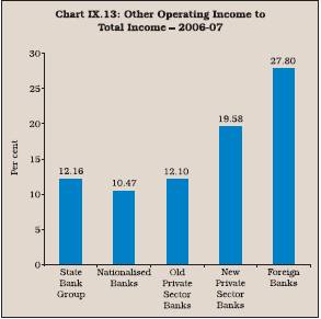 9.42 The share of other income in total income has been significantly higher for both new private sector banks and foreign banks than public sector banks and old private sector banks. This was mainly on account of large size of off-balance sheet exposure of foreign and new private sector banks as compared with public and old private banks (Chart IX.13).