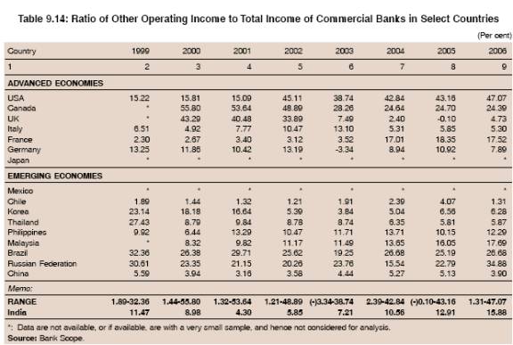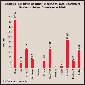 9.43 The significance of other operating income of banks in India has increased mainly on account of banks’ foray into non-traditional activities. However,it is still low as compared with the USA, France and Canada in the developed world and Brazil and Russia among the emerging market economies (Table 9.14 and Chart IX.14).