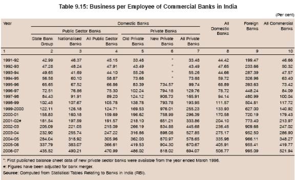 9.46 The entry of new private sector banks appears to have provided impetus for expansion of business per employee of public sector banks and old private banks by creating highly competitive environment, apart from introducing aggressive marketing strategies and hybrid products. Intense competition led to expansion in banking products, penetration of banking into unbanked areas, expansion of business through aggressive marketing strategies ably supported by technology such as core banking solutions. Higher economic growth rate and higher gross domestic savings coupled with lower penetration of other saving products also resulted in rise in deposits and credit. Public sector banks also benefited from the rationalisation of workforce through VRS undertaken during the early 2000s and introduction of practices whereby some routine jobs were outsourced. Banks focussed on generation of banking services through human capital intensive processes in line with improved technologies rather than manpower intensive banking. The rise was also discernable in the case of foreign banks, but not as sharp as that of public sector banks. The growth in business per employee of both the new private sector and foreign banks tapered off during the last two years, while it continued to rise in the case of public sector banks.