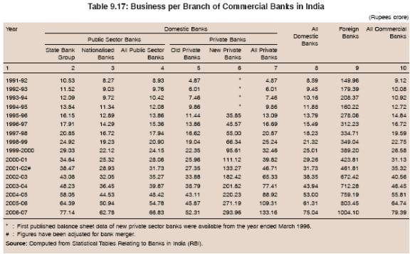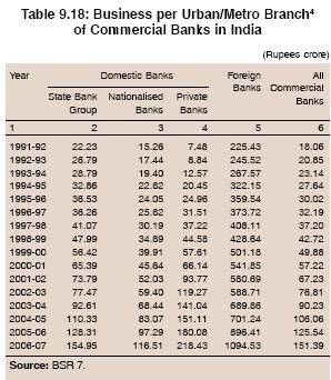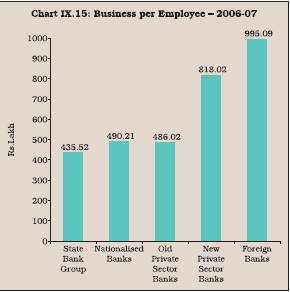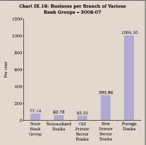 9.49 During 2006-07, the business per branch of foreign banks was almost 3.5 times that of new private sector banks and almost 15 times that of the State Bank group and nationalised banks (Table 9.17, Chart IX.16). The relatively low business per branch of public sector banks could be attributed to large proportion of rural branches where the size of transaction is small. On the other hand, foreign and new domestic private sector banks operate largely in urban areas and manage accounts of high net worth individuals and premium corporates. This was also evident from the size of business per urban/metro branch, which in the case of foreign banks and private sector banks, was significant in comparison with public sector banks (Table 9.18).