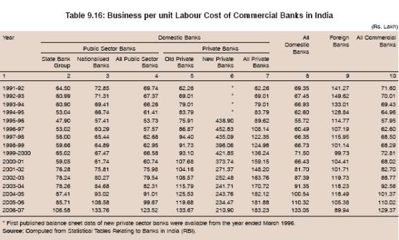 9.47 However, in terms of business per unit labour cost, public sector banks compared favourably with other bank groups, barring new private sector banks (Table 9.16). The ratio for both new private sector and foreign banks moderated between 1996-97 and 2006-07, possibly because of a sharp rise in labour cost in these banks, while the ratio for public sector banks showed a steady rise mainly because of low wage productive labour. New private sector banks were far ahead of all other bank groups. During 2006-07, business per unit labour cost was the highest for new private sector banks, followed by nationalised banks, old private sector banks, State Bank group and foreign banks.
