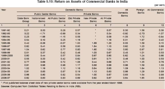 9.51 Notwithstanding increased competition in the banking system in India, the return on assets improved significantly from 0.39 per cent in 1991-92 to 1.13 per cent in 2003-04, albeit with some fluctuations, before stabilising at around 0.90 per cent in the following three years (Table 9.19). The significant improvement in the profitability ratio is all the more significant as the intermediation cost of the bank declined during the same period.