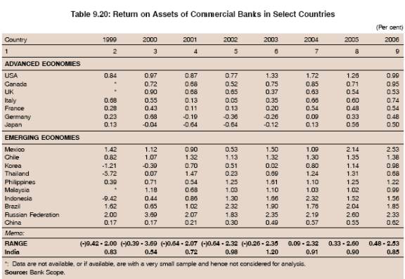 9.60 Most of the performance indicators of the Indian banking sector compare favourably with banks in advanced and other emerging economies. For instance, the cost to income ratio in India was better than banks in many developed countries such as Canada, France and Germany. Similarly, in terms of operating cost to total assets, banks in India were better placed than those in several EMEs such as Mexico, Chile, Thailand, Philippines, Indonesia, Brazil and Russia. Although labour cost experienced a steady decline between 1999 and 2006, it was still above 1 per cent of earning assets in banks in India, unlike banks in many EMEs such as China, Korea and Malaysia and most of the advanced countries in the developed world. This suggests that there is a scope for improvement in labour cost. On the other hand, in terms of net interest margin (NIM), banks in China, Korea and Malaysia were better placed than those in India. The contribution of non-traditional sources to banks’ income (non-interest income) was higher in India than in many advanced economies such as UK, Italy and Germany. Similarly, return on equity in India in 2006 was higher than that in many advanced economies such as US, Italy, Germany and Japan as well as most emerging market economies.