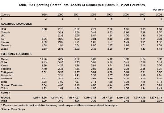 9.18 A cross country comparison reveals that the ratio of operating expenses to total assets declined in several advanced economies and EMEs between 1999 and 2006 due mainly to growing competitive pressures within and across the borders. Although the ratio in India was higher than that in advanced countries, it compared favourably with most emerging market economies (EMEs). While the ratio was generally less than two for advanced economies during 2006, it ranged widely between 1.43 and 7.13 in EMEs. Also, the ratio in EMEs in Asia was lower than that of Latin America and Eastern Europe (Russia). The ratio in the case of India compared favourably with Thailand, the Philippines and Indonesia, but unfavourably with Korea, Malaysia and China (Table 9.2 and Chart IX.3)1.