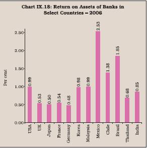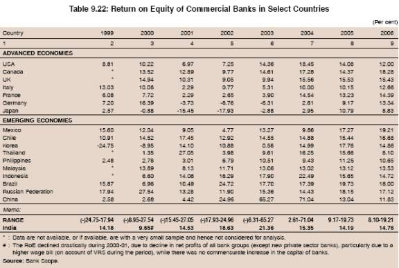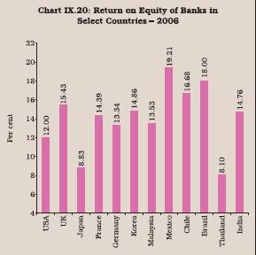 9.56 The RoE of banks in different countries varied widely between 1999 and 2006. The ratio during 2006 varied between 8.10 (Thailand) and 19.21 (Mexico). The RoE of Indian banks was comparable with the banks in the USA, Italy, Germany, and some EMEs such as Korea and Indonesia. The RoE in Brazil and Russia were much higher than many other countries, indicating the very high spread levels enjoyed by the banks in these countries, as alluded to earlier (Table 9.22 and Chart IX.20).