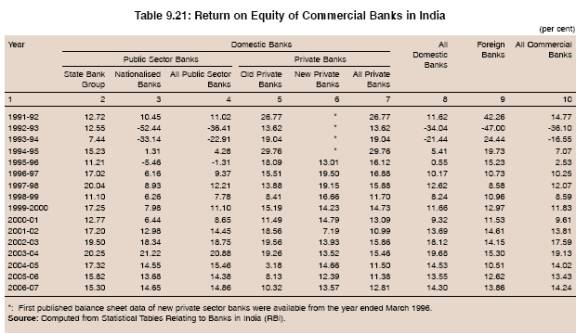 9.55 The return on equity in the case of Indian banks exhibited almost similar trends as that of RoA. The RoE of all commercial banks fluctuated widely during 1991-92 to 2006-07 in consonance with the profitability and prevailing capital position in India. However, unlike RoA, RoE of public sector banks was comparable even with foreign banks. In fact, RoE of public sector banks, new private sector banks and foreign banks converged to around 14-15 per cent in 2006-07, while that of old private sector banks lagged behind somewhat (Table 9.21 and Chart IX.19). The RoE declined drastically during 2000-01 due to fall in net profits in all bank groups except new private sector banks. Decline in case of public sector banks was particularly due to higher wage bills, inter alia, on account of VRS payments during the period.