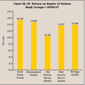 9.59 The profitability ratio of foreign bank group during 2006-07 was the highest on account of higher net interest margins combined with higher share of non-interest sources of income. However, the return on equity during 2006-07 was the highest for the State Bank group, followed by nationalised banks (Table 9.23).