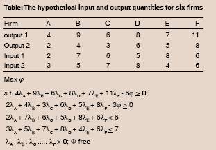 Non-parametric: The main non-parametric approaches are data envelopment analysis (DEA) and free disposal hull (FDH). DEA employs mathematical programming to construct a best practice frontier from the observed data and to measure efficiency relative to the constructed frontier. The DEA does not require output or output prices for identifying the best practice production frontier. The best practice frontier is identified as piece-wise linear combination that connects the set of best practice observations, given the specifications of inputs and outputs. The outcome is to produce a convex production frontier for output oriented DEA and concave production frontier for input oriented DEA (Berger and Humphrey, 1997). As a consequence, DEA efficiency score for a decision making unit (DMU) is not defined by an absolute standard but is defined relative to other forms (Refer Box IX.6).DEA generates a within sample efficiency score between 0 and 1, with 1 being the most efficient.