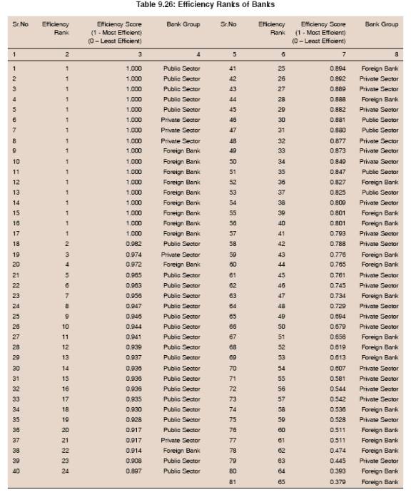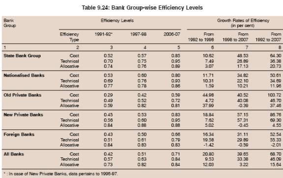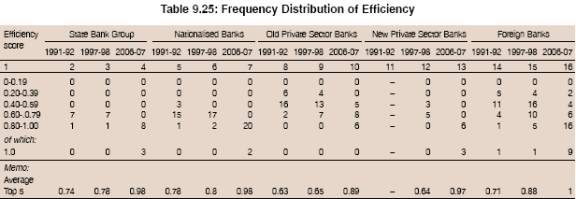 9.113 DEA estimates indicate considerable improvement in the efficiency of the banking sector with efficiency score rising from 0.42 in 1992 to 0.71 in 2007 (the maximum achievable efficiency level being 1.0). There is also evidence that banks in the public and private sectors are gradually catching up with their more efficient peers. However, the banking sector is still below the efficiency frontier and there is a scope to save inputs by 29 per cent to produce the existing level of output. At the individual bank level efficiency scores/levels vary considerably from as low as 0.38 to the maximum level of 1.0. Of the 81 banks, only 17 banks were on the efficiency frontier, while all other banks were below the efficiency frontier. Of these, as many as 22 banks operated at two-thirds of the feasible efficiency level, while four banks operated at less than one half the level of the most efficient banks in industry. These banks are in the private and foreign bank segments. The need is to bring improvement in the efficiency of all those banks which are far away from the efficiency frontier by identifying the underlying causes of their low efficiency.