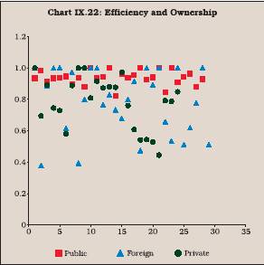 9.85 The analysis suggests that efficiency level has no definite relationship with ownership of banks, i.e., public or private in India. There are most efficient and least efficient banks both in the public and private sectors.