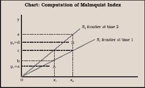 In contrast, the Malmquist Productivity Index (MPI) introduced by Caves, Christensen and Diewert (1982) is a normative measure that constructs a production frontier representing the technology and uses the corresponding distance functions evaluated at different input-output combinations for productivity comparison that is by comparing the proportion of output to input over two periods of time. The index ascertains up to what extent input in period 2 could be decreased by holding the output to the same level as in period 1. For computing the index, either of the periods could be taken as a reference point. In case technology in period 1 is taken as reference and computed value index exceed, it implies gain in productivity. On the other hand, index less than 1 indicates decline in productivity. An illustration using the one input and one output case is shown in Chart below.
