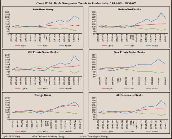 9.86 The productivity of the banking sector as well as various bank groups improved between 1991-92 and 2006-07. However, most of the gains resulted from the period 1997-98 onwards. The rise in productivity emanated primarily from technical progress (innovation) while banks, particularly in the public sector, were lagging behind in catching up/ absorption of enhanced technological capability into the system.