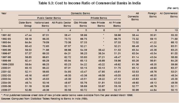 9.19 The cost to income ratio indicates how profitably the funds have been deployed by the banks. The ratio reflects the ability of a bank to generate revenue from its expenditure. It captures the impact of off-balance sheet operations and is, thus, a better measure of efficiency than the cost to assets ratio. For the industry as a whole, the cost to income ratio declined gradually from a peak level of 71.89 per cent in 1992-93 to 50.15 per cent in 2007 (Table 9.3). However, trends have varied across the bank groups. While the ratio moved up in the case of foreign and new private sector banks, it gradually declined for all other bank groups.