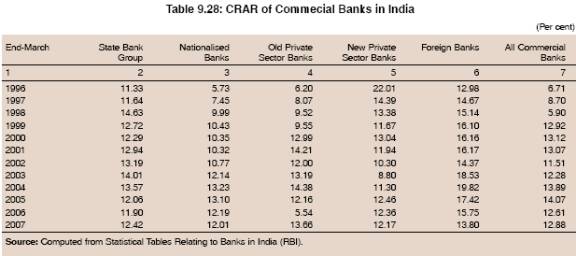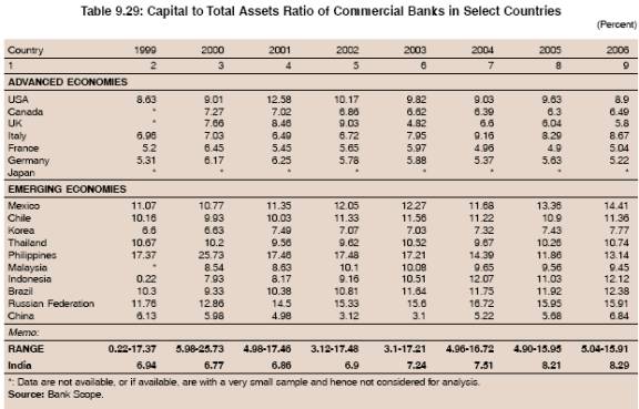 9.90 The CRAR of all the bank groups in India has improved over the years (Table 9.28). The CRAR of nationalised banks and old private sector banks, which was quite low at end-March 1996, gradually improved to more than 12 per cent by end-March 2007. On the other hand, the CRAR of State Bank group, new private sector banks and foreign banks was always above the minimum stipulated level of 8 to 9 per cent (9 per cent from March 31, 2000). In the case of new private sector banks, one bank reported significantly low CRAR, which pulled down the group average at end-March 2003. However, subsequently, the bank was merged with the healthier bank, thereby imparting strength to the system as a whole. 9.91 A cross-country comparison reveals that at the end of 2006, the capital to assets ratio (CAR) varied significantly among countries between 5 per cent and 16 per cent8 (Table 9.29). At the end of 2006, the capital to total assets ratio (CAR) in the banking system in most countries was more than 8 per cent. The CAR of banks in most of the developed countries ranged between 5 and 9 per cent. On the other hand, the CAR of banks in developing countries such as Mexico, Chile, Brazil and Russian Federation was at considerably higher levels. India’s CAR at 8.29 per cent compared favourably with several advanced and emerging market economies.