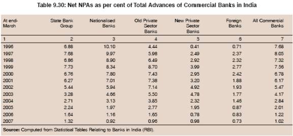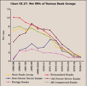 9.92 The soundness of a bank may be seriously impaired if its asset quality is poor. Non-performing assets require provisioning/write-off, which affects banks’ profitability and their ability to strengthen their capital position. In case the provisioning/write-off results in net losses, it could also erode bank’s capital position. Therefore, apart from sound capital position, it is necessary that banks maintain high asset quality. In India, non-performing assets of commercial banks gradually declined over the years (gross NPAs from 15.7 per cent at end-March 1997 to 2.5 per cent at end-March 2007 and net NPAs from 8.1 per cent at end-March 1997 to 1.0 per cent at end-March 2007). The most significant improvement in asset quality was observed in respect of nationalised banks, followed by old private sector banks and the State Bank group. As a result, net NPA ratios of all bank groups have converged to around 1 per cent (Chart IX.27 and Table 9.30). The improvement in the asset quality is all the more significant as income recognition, asset classification and provisioning norms were tightened periodically. The improvement in asset quality has been brought about by initiating several institutional measures such as balance sheet cleansing through compromise settlements of chronic non-performing assets, corporate debt restructuring, setting up of debt recovery tribunals and enforcement of security interest for realisation of dues without the involvement of judiciary.