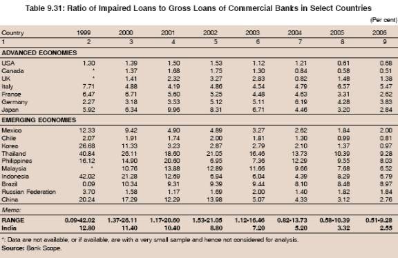 9.93 The ratio of impaired loans to gross loans, i.e., the ratio of non-performing assets (NPAs) to total advances declined in almost all the select countries studied during the period 1999-2006. The ratio of impaired loans to gross loans in India is currently comparable with most of the developed countries such as France, Germany and Japan and better than several EMEs such as Brazil,Thailand, Philippines, Malaysia and Indonesia (Table 9.31).