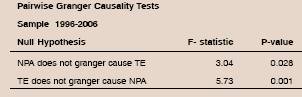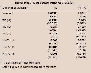 In order to test for the presence or absence of the four alternatives hypotheses, i.e., bad luck, bad management, skimping and moral hazard, explaining relationship between asset quality and efficiency, Granger causality tests were conducted based on the panel VAR with technical efficiency (TE) and net non-performing assets (NNPA) as the variables. The period for the study was 1996-2006. The Granger causality results show that NPAs Granger cause efficiency and vice-versa, implying that both bad luck and bad management hypotheses were significantly true for Indian banks for the period under review (1996-2006).