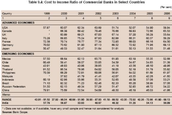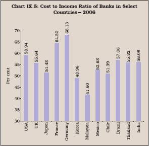 9.20 As a result, the gap in the ratio amongst different bank groups narrowed down over the years. During 2006-07, the cost per unit of income continues to be the least in the case of foreign banks, implying this group is most efficient in the industry, followed by nationalised and old private sector banks. In terms of this ratio, State Bank and new private sector bank groups are the least efficient (Chart IX.4). As per the international best practice norm, banks should strive to achieve cost-income ratio of 40 per cent2 . Therefore, India, with the cost to income ratio of 50.15 per cent, needs to cover a lot of ground to achieve international competitiveness and meet the best practice norm in rendering banking services. 9.21 Although the ratio of operating cost to income was higher than the desirable level, it may be noted that the ratio of Indian banks compared favourably with several advanced and emerging market economies (Chart IX.5). In most of the countries in the sample, the ratio was more than 50 per cent. Only in three EMEs, the ratio was close to 40 per cent (Malaysia, China and Korea). China was able to bring down the cost to income ratio by one half between 1999 and 2006 (Table 9.4).