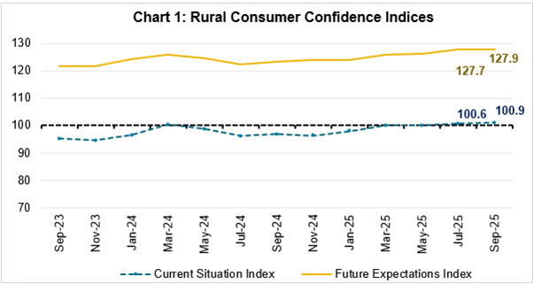 - Rural consumer confidence for the current period has improved marginally with the Current Situation Index (CSI)3 advancing further into the optimistic zone, supported by improved sentiments in most of the survey parameters (Chart 1; Tables 1, 2, 5, 6 and 9).
