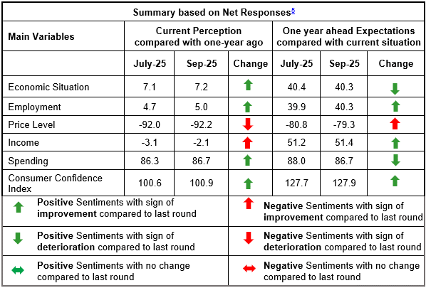 3CSI and FEI are compiled with the net responses on five survey parameters viz., general economic situation, employment, income, price level and spending, for the current period (as compared with one year ago) and a year ahead, respectively. CSI and FEI = 100 + Average of Net Responses of the above parameters.