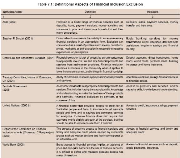 7.11 Definitions of financial exclusion in the literature vary depending on the dimensions such as ‘breadth’, ‘focus’ and ‘degree’ of exclusion. The ‘breadth’ dimension is the broadest of all definitions linking financial exclusion to social exclusion which defines financial exclusion as the processes that prevent poor and disadvantaged social groups from gaining access to the financial system (Leyshon and Thrift, 1995). The ‘focus’ dimension is in the middle of the spectrum that links financial exclusion to other dimensions of exclusion. It defines financial exclusion as the potential difficulties faced by some segments of population in accessing mainstream financial services such as bank accounts/home insurance (Meadows et al., 2004). The definitions laying emphasis on the ‘focus’ also vary significantly to include various segments of population such as individuals, households, communities, and businesses. The ‘degree’ dimension, which is the narrowest of all definitions of financial exclusion, defines financial exclusion as exclusion from particular sources of credit and other financial services including insurance, bill-payment services and accessible and appropriate deposit accounts (Rogaly, 1999). Finally, definitions of financial exclusion vary considerably according to the dimensions such as the concept of relativity, i.e., financial exclusion defined relative to some standard (i.e., inclusion). This line of thinking defines the problem of financial exclusion as that emanating from increased inclusion, leaving a minority of individuals and households behind (Kempson et al., 2000). Thus, there exists duality of hyper inclusion with some having access to a range of financial products and at the same time a minority lacking even the basic banking services. This phenomenon is observed mostly in developed countries with high degree of financial development.