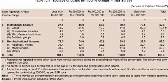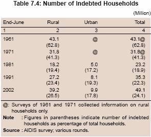 7.123 To sum up, according to the All India Debt and Investment Survey of the NSSO, the household indebtedness increased sharply between 1991 and 2002. This was mainly on account of sharp increase in consumption and other expenditure, which could not be easily financed from institutional sources. Data also suggest that in absolute terms, the number of households indebted to institutional sources, both in rural and urban areas, increased between 1991 and 2002. However, the proportion of households indebted to institutional sources and the share of institutional sources in households’ outstanding debt declined sharply between 1991 and 2002. A detailed analysis suggests that institutional agencies continued to increase credit to households between 1991 and 2002 more or less at the same rate as between 1981 and 1991. However, sharp increase in credit for consumption and other unproductive purposes from non-institutional sources resulted in a significant decline in the share of institutional sources in total number of indebted households and their outstanding debt.