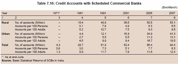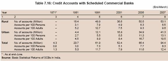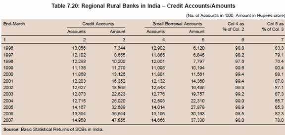 7.111 The number of savings accounts with RRBs, which are included in scheduled commercial banks data in Table 7.27, increased significantly between 1991 and 2006. In tandem with the growth in the number of accounts, the deposits with RRBs also increased (Table 7.28).