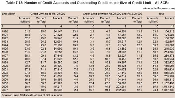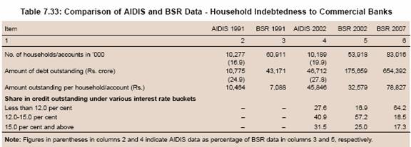7.119 A comparison of the NSSO’s All-India Debt and Investment Survey and the BSR data brought out by the Reserve Bank9 suggests that there are significant differences in the credit to households extended by banks (Table 7.33). The extent of household indebtedness to the banking system appears to be grossly underestimated by the NSSO data, both in terms of households/accounts and credit outstanding. Furthermore, number of credit accounts and amount outstanding in such accounts, as revealed by the BSR data, increased sharply between 2002 and 2007.