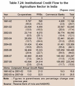 7.105 From the above analysis, it is evident that credit delivery from formal financial institutions to the relatively excluded segments has improved significantly in recent years due to various initiatives by the Reserve Bank and the Government. As a result, overall credit to agriculture by all credit institutions grew at an annual compound rate of 26.5 per cent between 2002-03 and 2007-08 as compared with 16.8 per cent between 1991-92 and 2001-02 (Table 7.24).