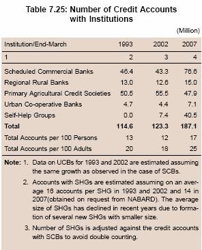 7.106 To sum up, there has been a distinct improvement in credit penetration (credit accounts per 100 persons) and credit flow to the rural sector in general and to agriculture since the early 2000s, that is, during the period subsequent to the reference year of AIDIS by the NSSO. Taking together all sources of formal credit, the number of credit accounts per 100 adults, which had declined from 20 in 1993 to 18 in 2002, improved to 25 in 2007 (Table 7.25).