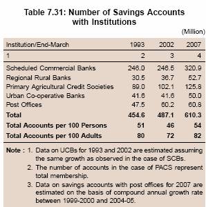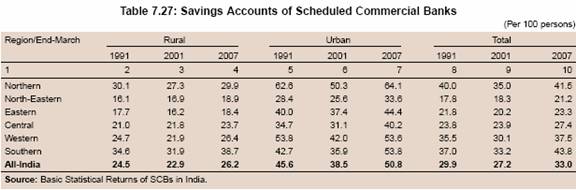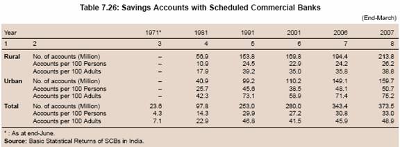 7.109 The number of savings accounts opened by SCBs expanded significantly over the years, especially between the early 1970s and the early 1990s. The expansion in savings accounts was much faster than the population growth, resulting in a substantial improvement in savings account penetration (savings accounts per 100 persons) (Table 7.26). The improvement was observed both in the urban and rural areas. The number of savings accounts per 100 persons/adults, which declined between 1991 and 2002, increased sharply thereafter. As a result, the number of savings accounts per 100 persons/adults at end-March 2007 was larger than that at end-March 1991. This reflects rise in the income levels and the various initiatives taken by the Reserve Bank such as urging banks to open ‘no frills’ accounts with ‘nil’ or low minimum balances.
