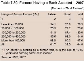 7.113 According to the Invest India Incomes and Savings Survey 2007, the proportion of respondents having savings accounts was significantly lower in the low income groups, than in the higher income groups. The proportion of population having a bankaccount increased with the increase in the level of income. The survey also indicated that around 45 per cent of respondents had a savings account with a bank. Furthermore, the number of savings accounts held in urban areas was higher than that in rural areas (Table 7.30).