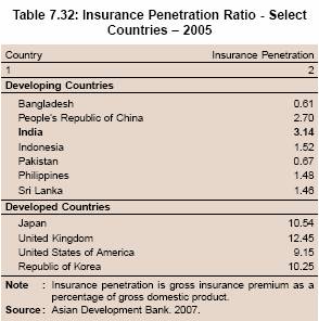 7.118 In most countries, a large segment of the population does not have access to formal insurance services. Micro-insurance services in a number of countries have begun to expand only in recent years. The Insurance Regulatory and Development Authority (IRDA) has been actively encouraging insurance services for low-income households. In 2002, the IRDA established rural and social sector targets for insurance companies. All insurers entering the business after the start of the IRDA Act, 1999 are required to comply with the obligations towards the rural and social sectors in a phased manner. In India, the total number of life insurance policies (individual single premium) was about 3.41 million in November 2007 (IRDA, 2008). This implies that there are only around 3.1 policies per thousand persons. The insurance penetration (insurance premium as percentage of GDP) in India was relatively higher as compared with several emerging market economies, but significantly lower than that in advanced economies (Table 7.32).