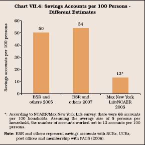 7.120 A comparison of the consolidated BSR data on savings accounts and other institutions (accounts with UCBs, post offices and PACS) with NCAER/Max New York Life survey also indicates significant differences in the extent of financial inclusion. According to data from banks and various other financial institutions, 54 persons out of 100 held a savings account with one or the other formal financial institution in 2007 as compared with 50 accounts per 100 persons in 2005. Assuming 5 persons as the average size of households, this works out to about 250 accounts per 100 households (2.5 accounts per household). NCAER/Max New York Life survey, on the other hand, found that 66 per cent households held account with a financial institution, which worked out to 13 accounts per 100 persons10 (Chart VII.4). The differences in the magnitude of financial inclusion/ exclusion of the various studies may, inter alia, be on account of data problems and differences in the methodologies, definitions and other factors discussed above. There is, therefore, a need to interpret the results based on the data from various sources carefully.