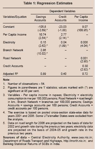 The literature on finance and growth suggests that financial inclusion is one of major determinants of economic growth. Higher economic growth and infrastructure, in turn, play a crucial role in promoting financial inclusion. It is, thus, argued that in order to achieve the objective of growth with equity, it is imperative that infrastructure is developed in tandem with financial inclusion as this would facilitate and enhance credit absorptive capacity. An exercise was undertaken to empirically examine the inter-relationship between financial inclusion and economic development in general and infrastructure development in particular based on State-wise panel data for 2001 and 2006. Savings and credit accounts per 100 persons were taken as proxy indicators of financial inclusion. Per capita income was used as an indicator of economic development and electricity consumption and road length were taken as indicators of infrastructure development.