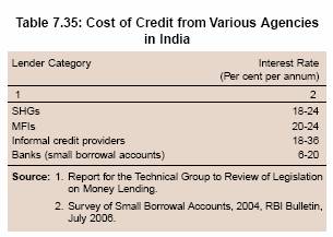 7.132 People in India avail credit from a number of agencies such as banks, MFIs and private moneylenders. The cost of borrowing from informal/semi-formal sources is significantly higher than the borrowings from banks (Table 7.35). The high cost of borrowings may be attributed to two factors, viz., operating cost and risk perception. The operating cost of extending credit through MFIs and SHGs models increases because these models involve an additional layer of intermediation between lenders and ultimate borrowers. As regards risk perception, the higher recovery rate in the case of SHGs, however, indicates that the risk perception about small borrowers should be low. Hence, the high rate charged by MFIs or informal agencies is either due to high operating cost or due to high interest margins charged. As is evident from the experience of several pilot projects in India as well as other countries, the operating cost of providing credit to small borrowers could be reduced significantly, implying that there is a large scope for reducing interest rates on small loans.