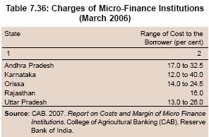 7.133 According to the Report on Costs and Margin of MFIs in India (CAB, 2007), the cost to the borrower of an MFI generally comprises interest rate and other charges such as processing/ administrative charges and upfront levies. The study shows that the all-in-cost to a borrower of an MFI varies widely across States with a median value of about 24 per cent (Table 7.36).