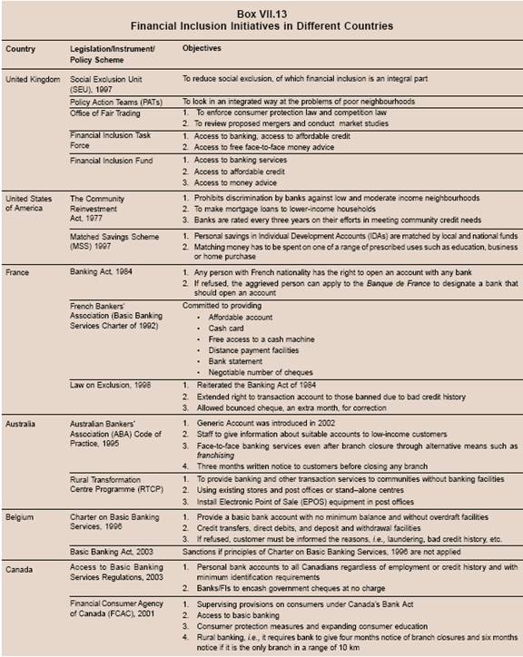 7.36 The issue of cost has been conceived from two angles, which are inter-twined. First, the exclusion may have cost on the individuals/entities in terms of loss of opportunities to grow in the absence of access to finance or credit. Second, from the societal or the national perspective, exclusion may lead to aggregate loss of output or welfare and the country may not realise its growth potential. Recognising the implicit and explicit cost of financial exclusion across the globe, many countries have initiated measures to deal with the same.
