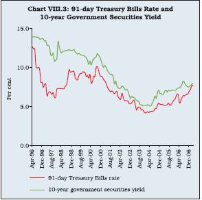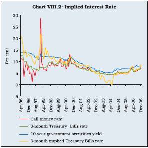 8.29 The integration of the credit market with other money market segments has become more pronounced in recent years. Sustained credit demand has led to higher demand for funds, exerting some pressure on liquidity. This was reflected in the decline in banks’ investment in government securities and higher activity in all the money market segments such as inter-bank call money, collateralised borrowing and lending obligation (CBLO) and market repo rates. Total volume in these three markets increased from Rs.16,132 crore in March 2005 to Rs.35,024 crore in March 2006 and further to Rs.38,484 crore in February 2007. Banks also resorted to increased issuances in the CDs market to meet their liquidity requirements. Outstanding CDs increased from Rs.12,078 crore in March 2005 to Rs.43,568 crore in March 2006 and further to Rs.77,971 crore by March 2, 2007.