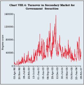 Segment-wise Integration 8.28 For effective market integration, it is essential that there exists a deep secondary market for government securities, which provides a benchmark for valuation of other market instruments, and the turnover of the instruments in both primary and secondary markets is fairly large. The turnover in the secondary segment of government securities market, indicating the depth of this market segment, inter alia, is influenced by some key factors such as monetary policy stance, banks’ SLR holding and credit demand by the private sector. This was evident in the rise in turnover in the secondary market for government securities, fuelled by banks’ excess SLR holding during the period of softening interest rates. In the recent period, following the tightening of policy stance and rise in credit demand, banks have reduced SLR holdings close to the prescribed limit. Reduction in volumes in the secondary segment of government securities in the second half of 2006 was mostly due to rise in interest rates apart from demand side factors. The secondary market turnover has, thus, declined in the recent period (Chart VIII.4). This trend, if persists for long, could affect the depth and yield in this segment and consequently pose some challenges for effective market integration. International evidence suggests that banks tend to rebalance their portfolio and reduce their holding of government securities when interest rates rise. For instance, in the US, the proportion of government securities held by commercial banks in total US government securities declined to 1.6 per cent in 2005 from 5.3 per cent in 2003 when the interest rates rose following increase in the Federal Funds Rate from 1.25 per cent in 2003 to 5.0 per cent in 20052 .
