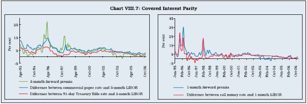 8.33 The Uncovered Interest Rate Parity (UIP) implies that ex-ante, expected home currency returns on foreign bonds or deposits in excess of domestic deposits of equal maturity and default risk should be zero. The currency composition of the asset holdings is, therefore, irrelevant in determining relative returns. The prevalence of UIP also implies that the cost of financing for domestic firms in domestic and foreign markets would be the same. Operating through rational expectations, the UIP suggests that expected changes in the nominal exchange rates should approximate the interest rate differentials. In the Indian context, though empirical studies confirm the existence of CIP, they dispute the existence of UIP. Usually, if CIP holds, UIP will also hold if investors are risk-neutral and form their expectations rationally, so that expected depreciation of home currency equals the forward discount (Box VIII.4). 8.34 As alluded to earlier, the equity market has relatively low and negative correlation with other market segments (Table 8.2). The low correlation of the equity market with risk free instruments is indicative of greater volatility of stock returns and the existence of large equity risk premium. The large risk premium occurs when equity price movements cannot be rationalised with standard inter-temporal optimisation models of macroeconomic fundamentals such as consumption and savings (Mehra and Prescott, 1985). This could be on account of different participants in the equity and other financial markets. For instance, the common participation by banks in the money, the government, the foreign exchange and the credit markets ensures fairly high correlation among these segments. The exposure of banks to the capital market remains limited on account of restrictions due to prudential regulation. A major reason for the surge in equity prices could be due to demand-supply mismatches for equity securities. In fact, a large proportion of equities is held by promoters and institutional investors as detailed in Chapter VII. The supply of securities for retail investors could possibly be lagging behind their demand. Equity prices, however, have relatively higher correlation with the forward exchange rate than other market interest rates. This is because portfolio investors, mainly, the FIIs, are allowed to hedge their exposure in the foreign exchange market through the forward market. 8.37 Developed and integrated financial markets are pre-requisites for effective and credible transmission of monetary policy impulses. The success of a monetary policy transmission framework that relies on indirect instruments of monetary management such as interest rates is contingent upon the extent and speed with which changes in the central bank’s policy rate are transmitted to the spectrum of market interest rates and exchange rate in the economy and onward to the real sector (Mohan, 2007). Deviations between money market rates and the policy interest rate, in particular, have at least two adverse effects. First, they weaken the monetary policy transmission mechanism and introduce an element of uncertainty. Greater the influence the central bank has over interest rate levels, the easier it is for it to manage demand in the economy and attain its objective of low inflation and sustained growth (Petursson, 2001). Second, a large spread entailing a mismatch between inter-bank rates and the central bank’s policy rate could lead to inefficiencies in the financial intermediation process. In the Indian context, there has been convergence among market segments, with a significant decline in the spread of market interest rates over the reverse repo rate (Table 8.4). The spread was the lowest for the inter-bank call money rate followed by rates on Treasury Bills, certificates of deposit, commercial paper and 10-year government bond yield. The benefit of financial markets development percolating to the private sector was also evident from the moderation in spread of commercial paper over the policy rate. The narrowing of the spread between the policy rate and other market rates suggests the increasing efficiency of the transmission mechanism of monetary policy. 8.38 Besides correlation measure, more formal and robust approach to market integration analysis entails an investigation of causal relationship among various interest rates. The causal relationship between reverse repo rate and market interest rates, in particular, highlights the importance of monetary transmission in influencing the term structure of interest rates. Empirical analysis of Granger causality reveals certain important features of transmission mechanism in the Indian context5. First, lags associated with the transmission of policy impulses to market rates are aligned with the term structure of instruments; short-term rates exhibit relatively lower lags than medium and longer maturity instruments to the changes in policy rates. Second, the reverse repo rate has uni-directional causal effect on short-end of the financial market, including call money rate and 91-day Treasury Bills rate. In the medium-to-longer term horizon, 10-year Government bond yield has a bi-directional causal association with the reverse repo rate. This could be attributed to the feedback between policies and markets, since at the longer end, financial markets contain useful information about investment activity and economic agents’ expectations about inflation and growth prospects. Box VIII.4 In the context of a country’s international financial integration, an important issue is the degree of foreign exchange market efficiency, which can be examined through empirical evaluation of ‘covered interest parity (CIP)’ and ‘uncovered parity (UIP)’ hypotheses. The interest parity hypothesis is important from a policy perspective (Blinder, 2004). First, the CIP reflects information efficiency of the foreign exchange market. Deviations from CIP can arise because of imp