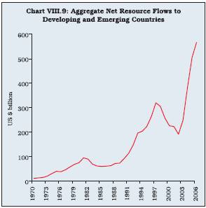 8.48 A key feature of global financial integration during the past three decades is the shift in the composition of capital flows to developing and emerging market economies. First, private sector flows have outpaced official flows due to increasing liberalisation. Second, a shift has occurred in terms of components, from the dominance of debt flows in the 1970s and the 1980s to foreign direct investment (FDI) and portfolio flows since the 1990s (Table 8.9). FDI flows have been determined by several push and pull factors, including strong global growth, soft interest rates in home countries, a general improvement in emerging market economies’ risks, greater business and consumer confidence, rising corporate profitability, large scale corporate restructuring, sharp recovery of asset prices and rising commodity prices. Trade and FDI openness has encouraged domestic institutional and governance reforms promoting trade and investment further. The hope of better risk sharing, more efficient allocation of capital, more productive investment and ultimately higher standards of living for all have also propelled the drive for stronger regional connections of financial systems across the world. In terms of overall financial flows, Asia has benefited from the surge in net capital flows to emerging markets in recent years.
