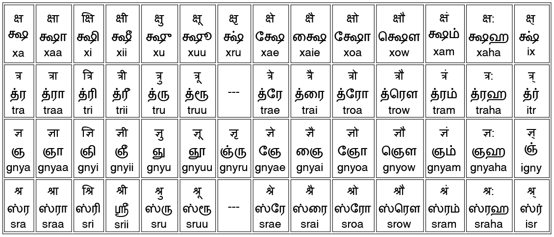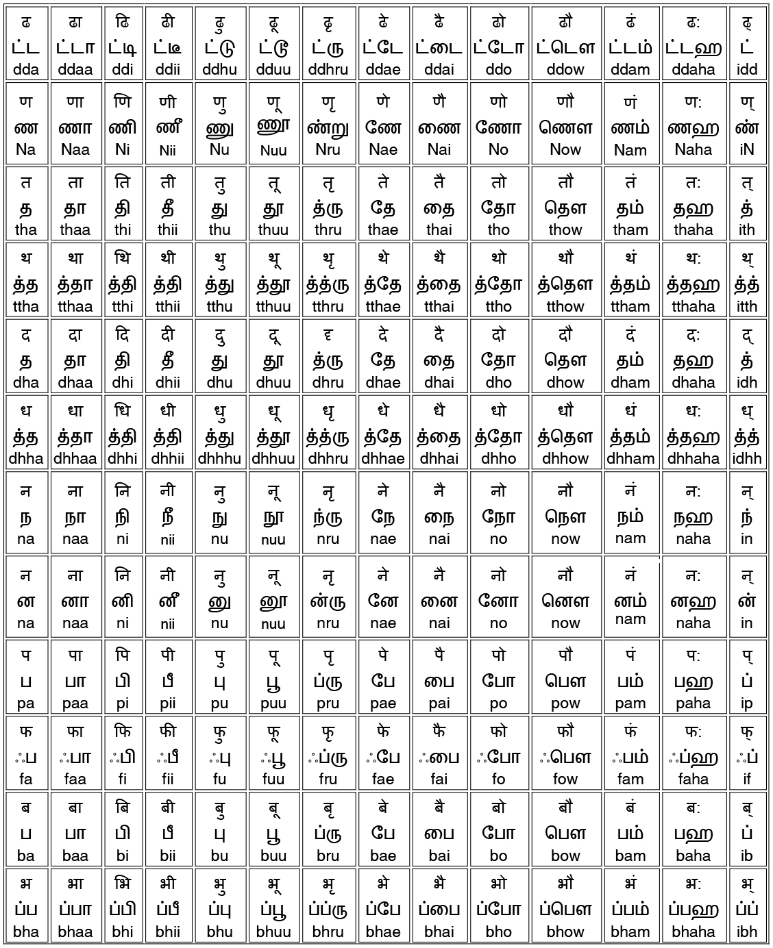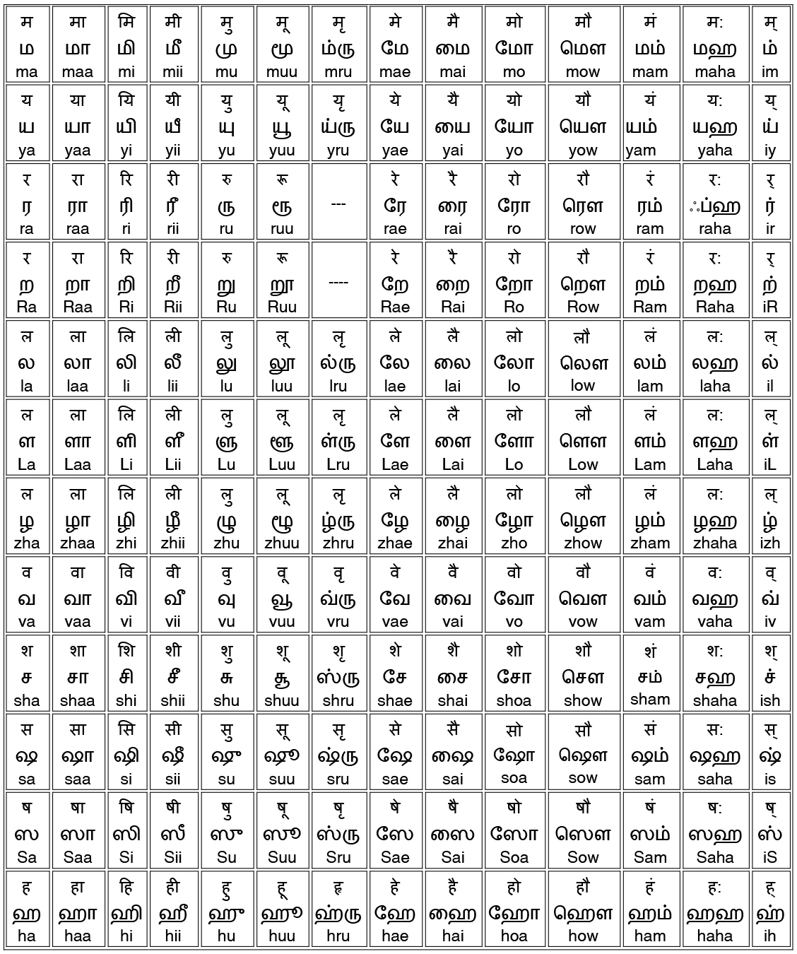 1.3 உயிர்மெய்யெழுத்துக்கள் (उयिरमेय्येलुत्तुक्कल) बारहखड़ी